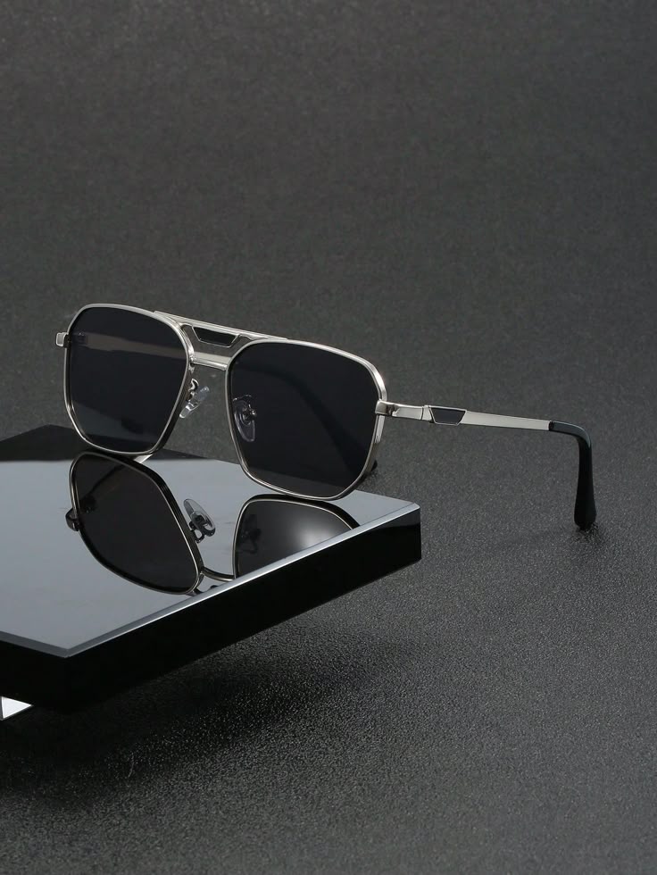 Sunglasses: The sunglasses have a modern design with a silver-colored metallic frame. The lenses are dark, appearing black or very dark gray, and are octagonal or slightly rectangular in shape. There’s a prominent double bridge connecting the two lenses, a common feature in aviator or pilot-style sunglasses. The temples (arms) of the sunglasses are also metallic silver, with black tips that curve to fit behind the ears. A small, dark, possibly textured or patterned detail is visible on the sides of the temples near the hinges.