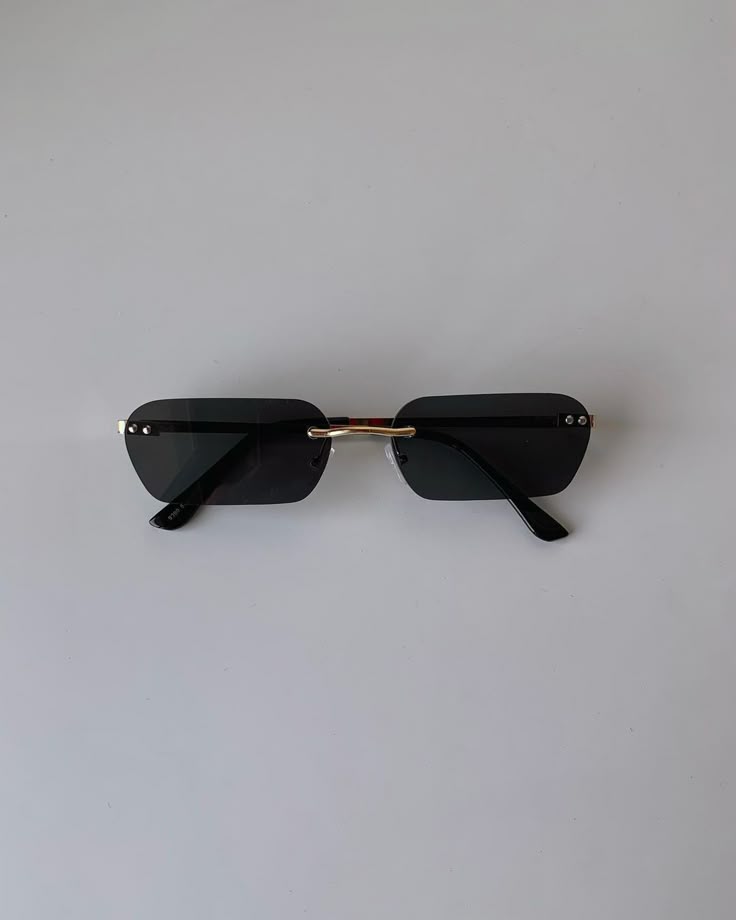 Sunglasses: The sunglasses are sleek and modern with dark, possibly black or very dark grey, rectangular lenses. They are rimless, meaning the lenses are directly attached to the temples (arms) and the bridge. The temples and bridge appear to be a metallic, possibly gold or silver, color. The nose pads are transparent.