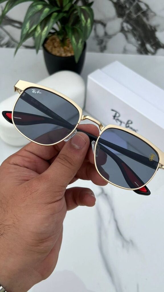 Sunglasses: The frames are a shiny gold color, and the lenses are a dark, possibly grey or black tint. There’s a small emblem, possibly the Ray-Ban logo, visible on the top right corner of the right lens. The arms of the sunglasses seem to have a red and black detail near the hinge.