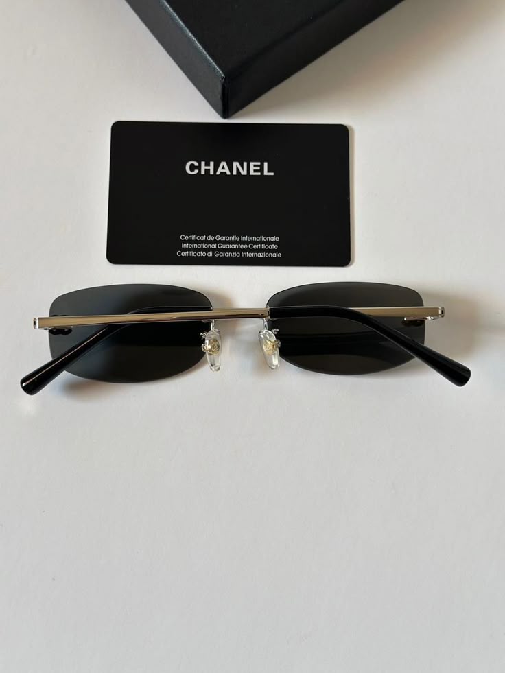 This image displays a pair of rimless sunglasses and a Chanel authenticity card on a light-colored surface.