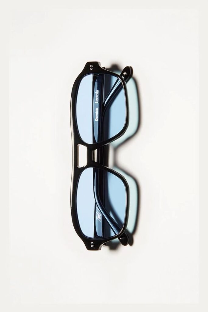 - Frame: Bold black acetate frame with a chunky, rectangular shape. It features a distinctive double “X” detail on the upper corners, adding a designer or signature flair.