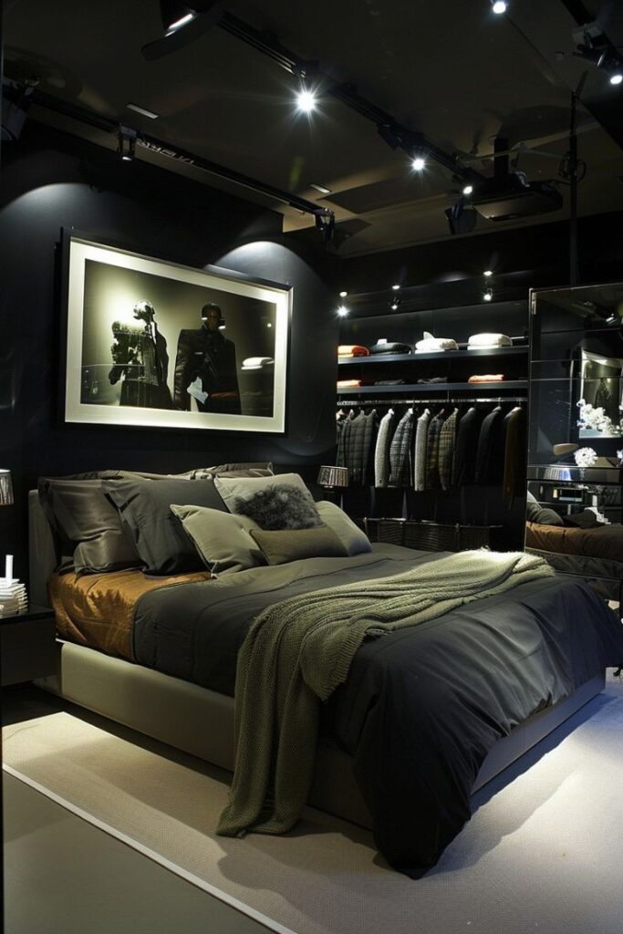 This image depicts a luxurious, masculine modern bedroom with strong fashion-forward and cinematic vibes. Here’s a full breakdown: