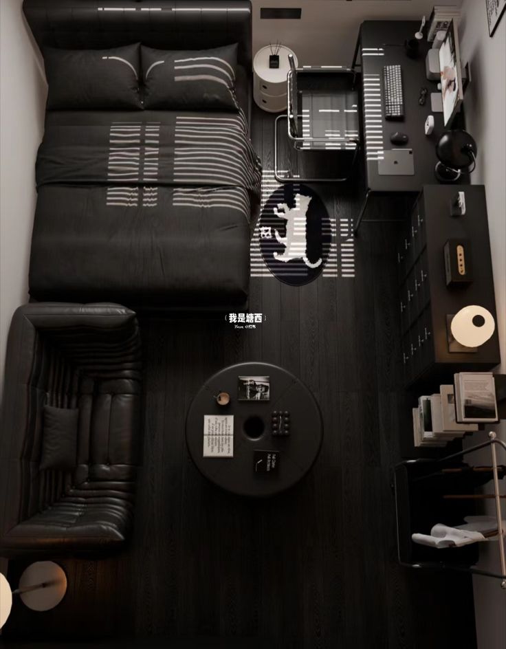 This image showcases a sleek, top-down view of a compact modern bedroom with an all-black theme and strong masculine energy. Hereโs a breakdown of the key elements and atmosphere: