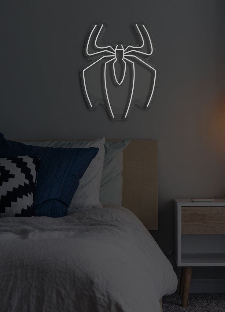 This image shows a cozy, modern bedroom setup featuring a glowing Spider-Man logo neon light mounted on the wall above the bed. Here’s a detailed description: