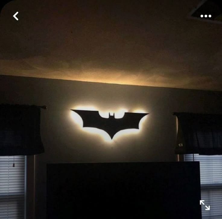 This image shows a dark-themed bedroom or entertainment room setup featuring a dramatic Batman logo wall light. Here’s a detailed description: