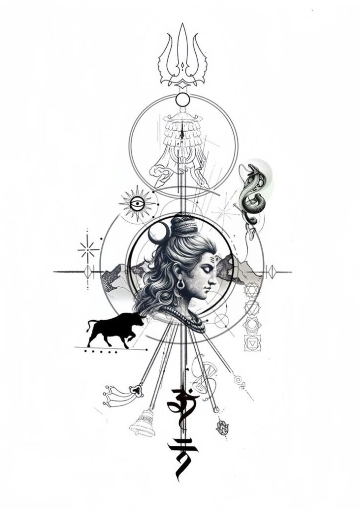 This image is a spiritual and symbolic tattoo design centered around a highly stylized and detailed depiction of Lord Shiva, a principal deity in Hinduism, known as the destroyer and transformer.
