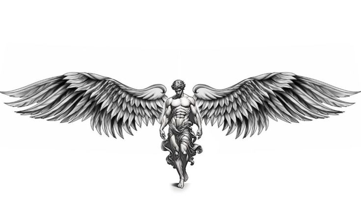 This striking black and white illustration features a winged male angelic figure in a bold and symmetrical pose—an ideal tattoo design for strength, protection, and spiritual balance.