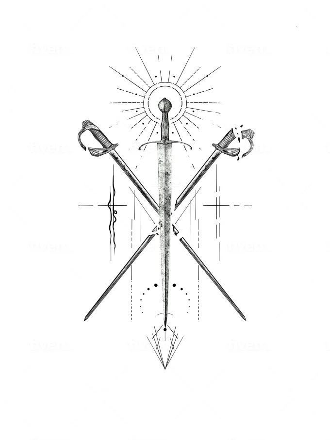 This image is a black and white tattoo-style illustration featuring three swords arranged symmetrically in a striking geometric and symbolic design. Here’s a detailed description: