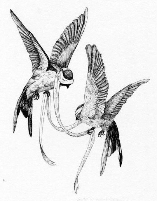 This image showcases a detailed black-and-white drawing of two swallows in flight, artistically entwined with flowing ribbons. It has a classic, vintage aesthetic often seen in traditional tattoo or naturalist illustration styles.